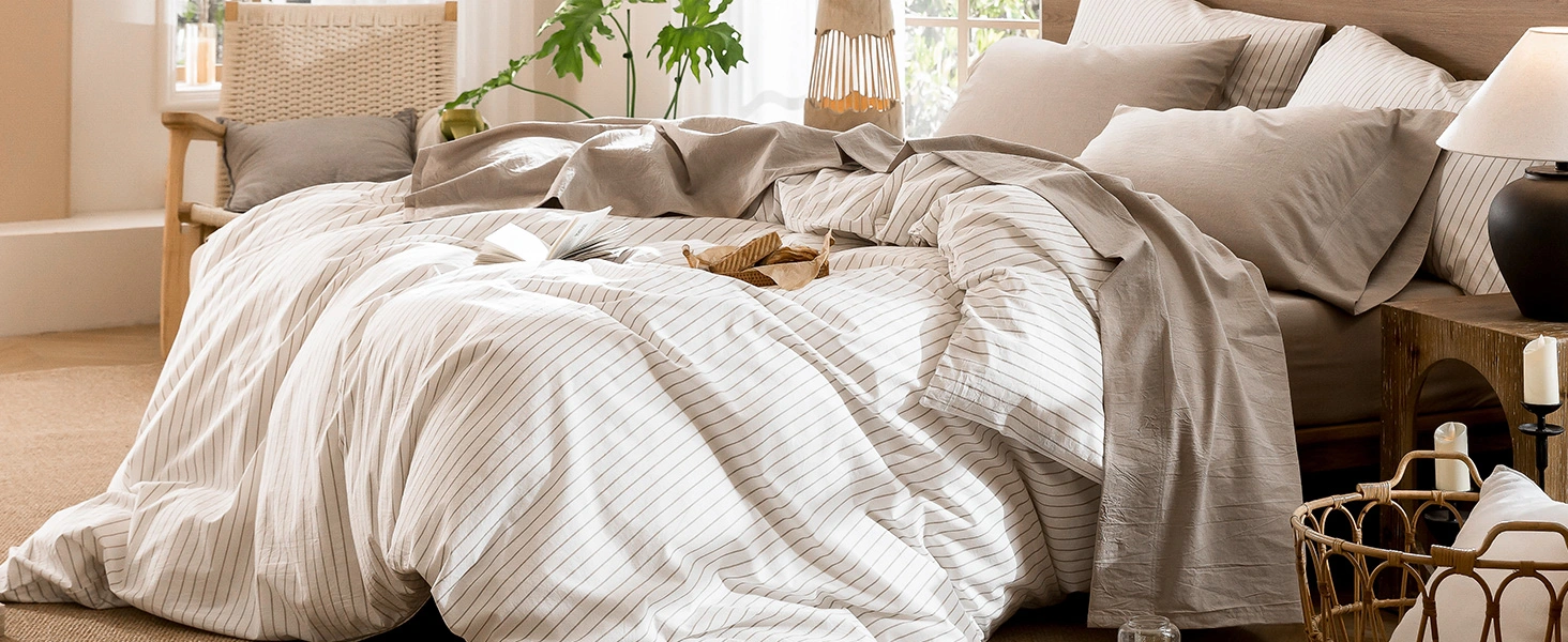 The 100% Cotton Linen-Like Collection by MooMee is soft, breathable, and effortlessly elegant—a timeless classic for any bedroom. Available in multiple colors, this versatile collection includes striped & solid duvet covers, sheet sets & pillowcases designed for ultimate comfort and style.