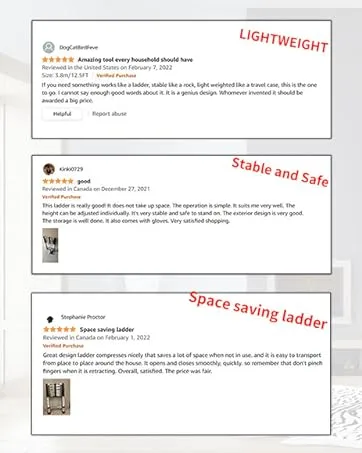 ✔【Portable and Compact】:The lighteweight telescoping ladder and the handrail designed at the bottom make the ladder easy to carry to common scenarios, while the extension ladder can be easily stored under beds, in corners, in storage cabinets and in cars.